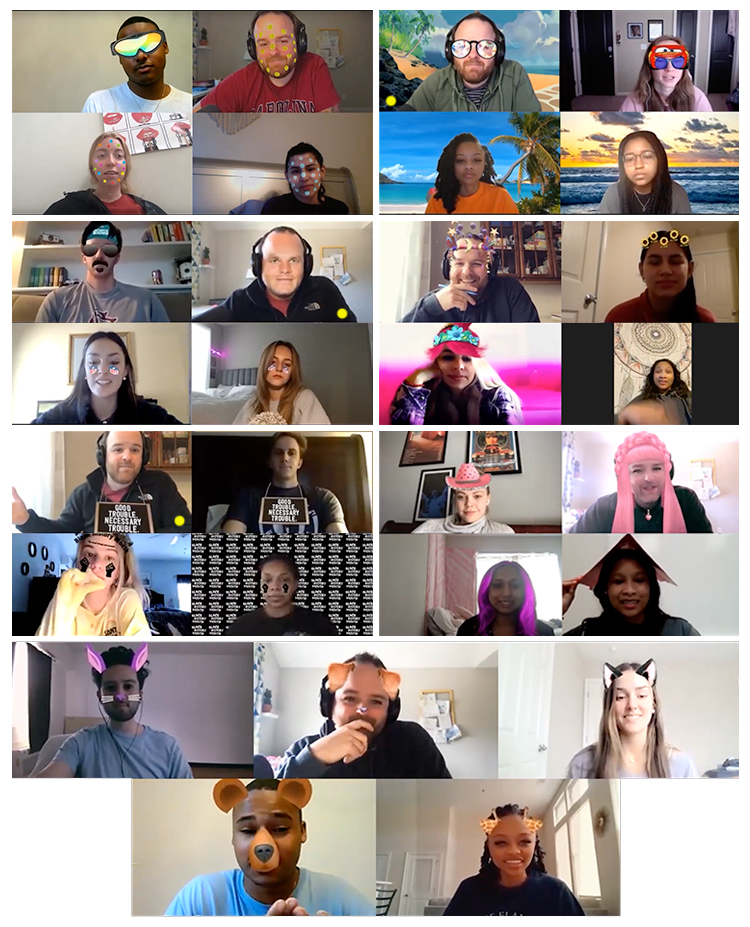 Below, you'll find screenshots of some of our virtual group discussions, along with a collection of student-selected Snapchat lenses. These lenses, spanning themes from Beach Day to Black History Month, offered engaging visual elements to our conversations. The Snapchat filters I designed for the discussions are marked with a yellow dot, providing a creative twist to our class interactions.