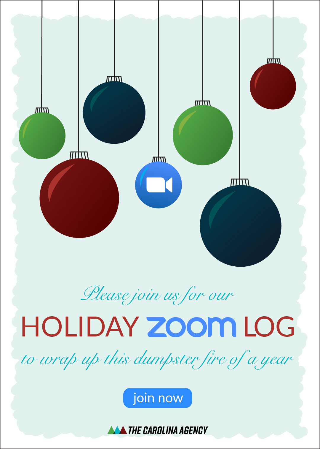 This holiday from The Carolina Agency was sent out to all their clients. When you click on the link it opened a zoom meeting to the continuously looping video you see here, which ran continuously for the last two weeks of the year.